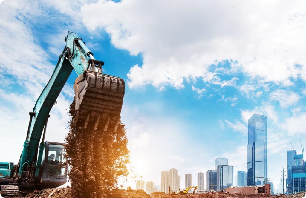 Urban construction site with numerous cranes framing rising skyscrapers against a blue sky.